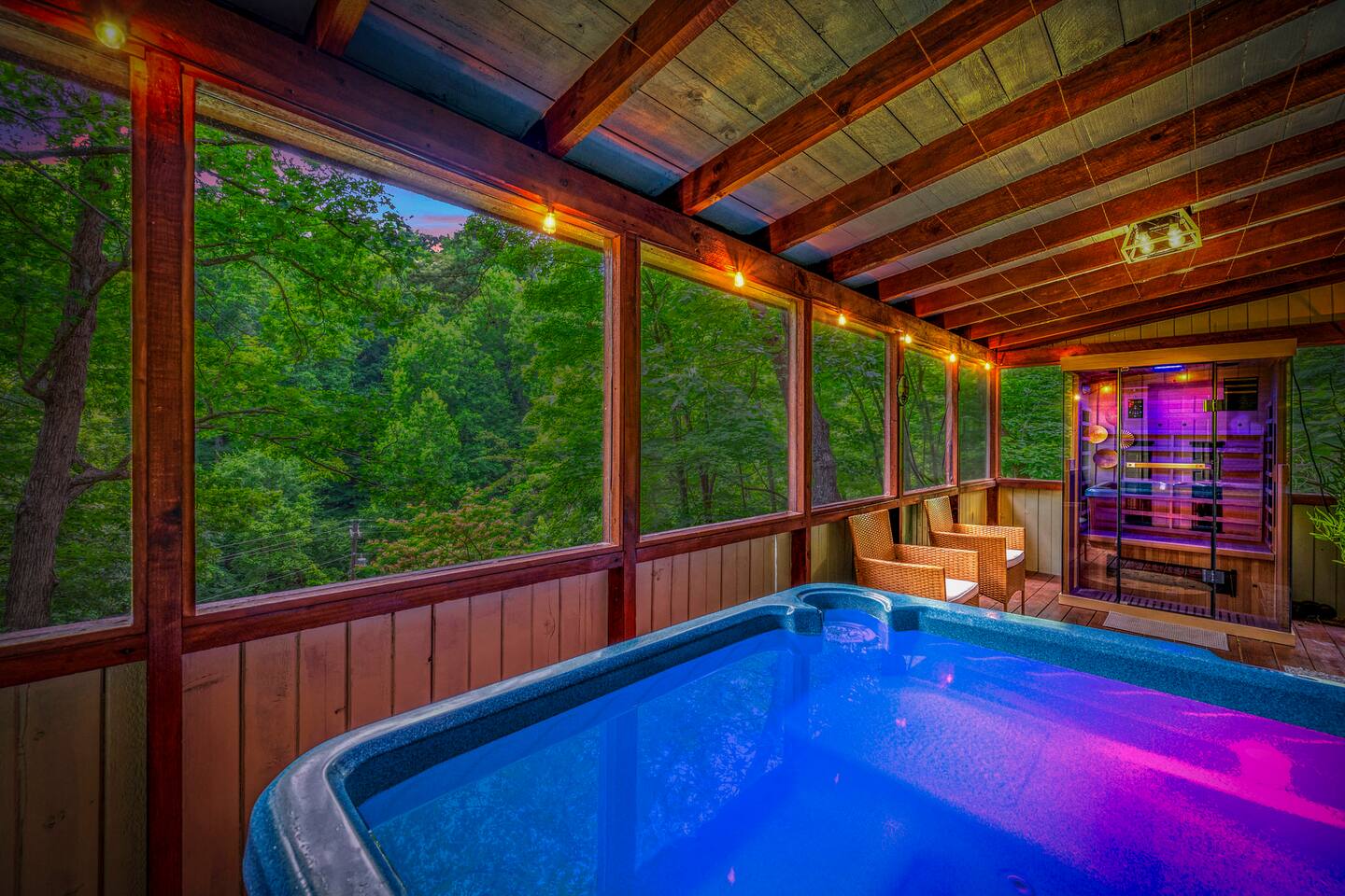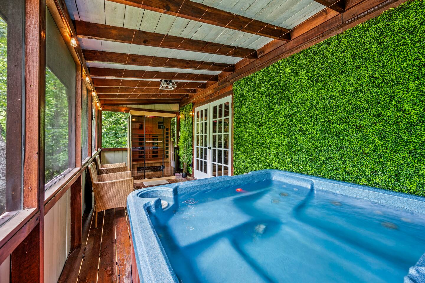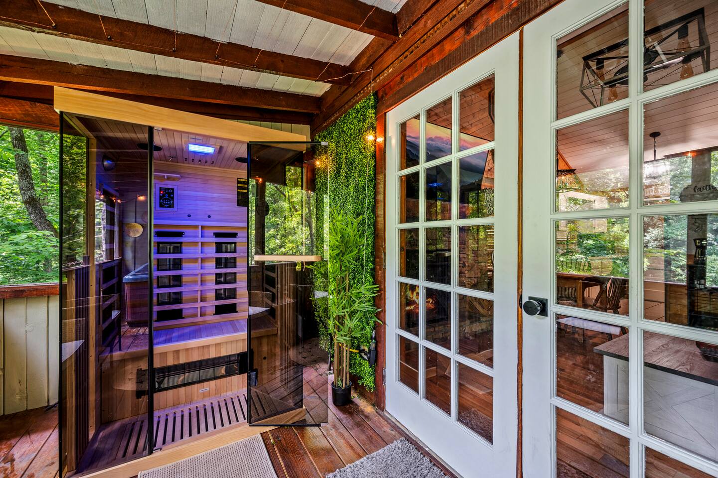 Discover Bluff Haven: A Modern-Rustic Smoky Mountains Retreat! Perfect for families or couples, this 2BR/2BA cabin boasts a full kitchen with Keurig cappuccino maker, a Private Zen Zone with hot tub, and FAR Infrared Sauna with color therapy! Enjoy serene natural surroundings and access to a community pool and fishing pond. Located between Wears Valley and Pigeon Forge for endless adventure. Book your Smoky Mountains escape today!