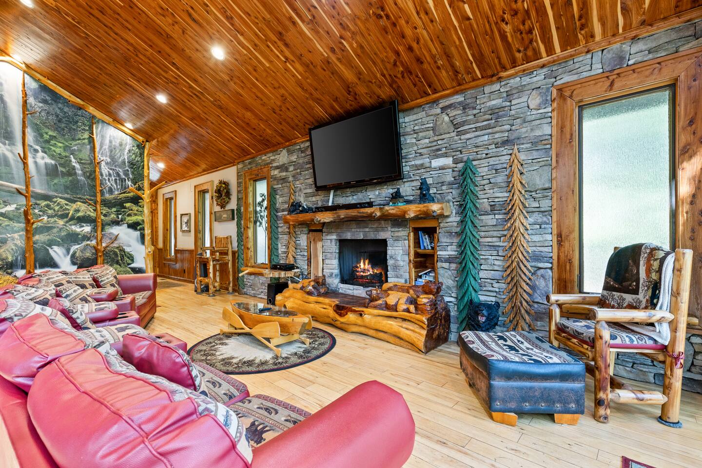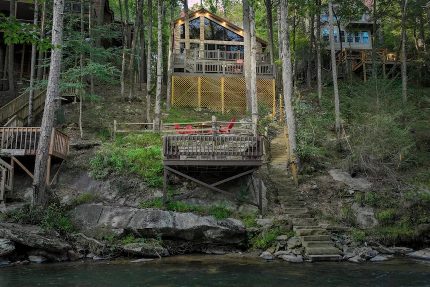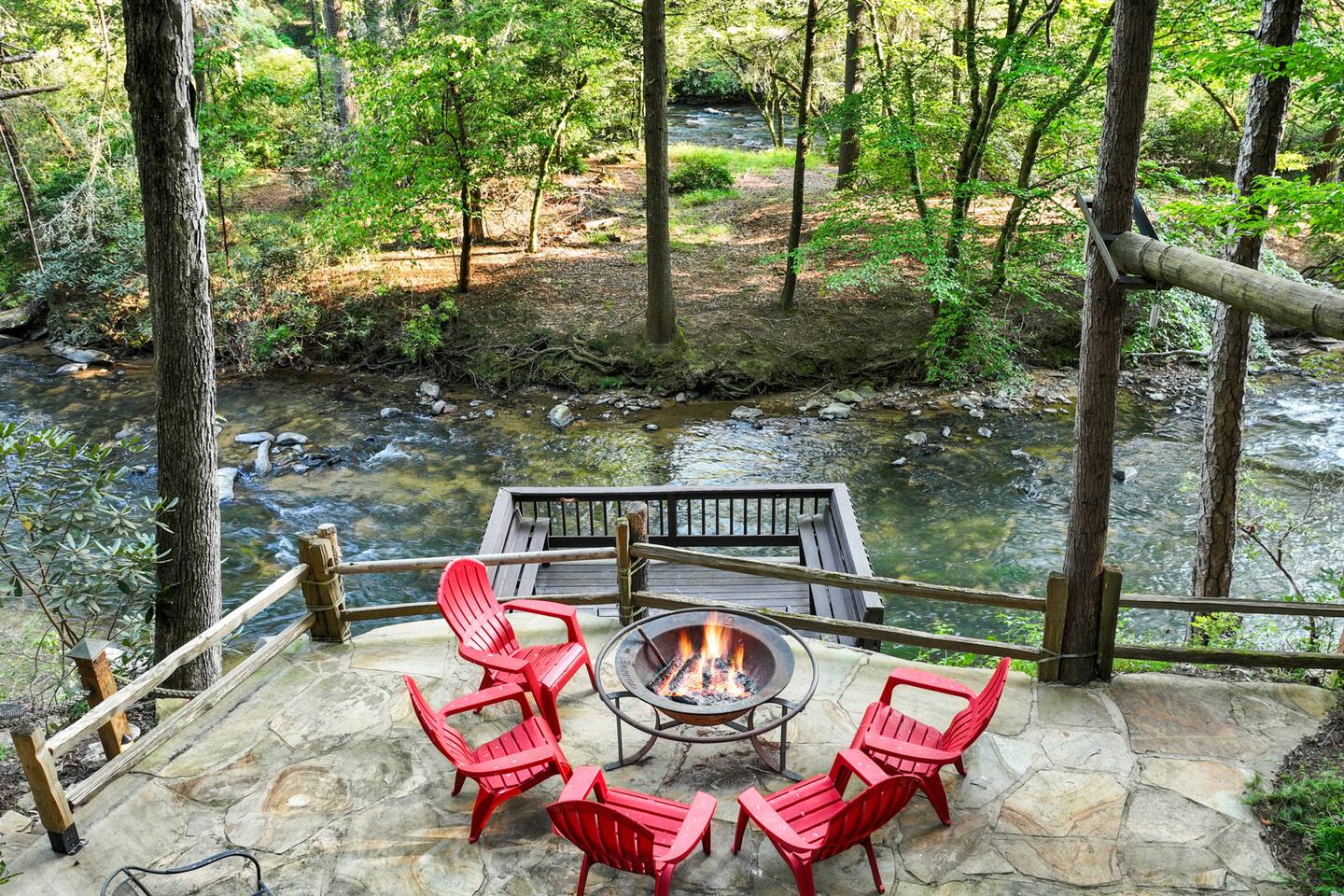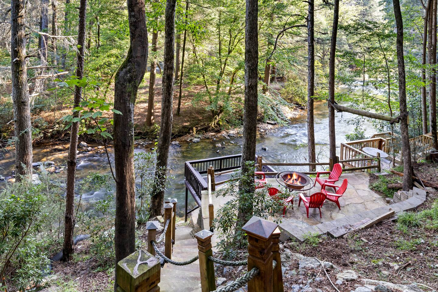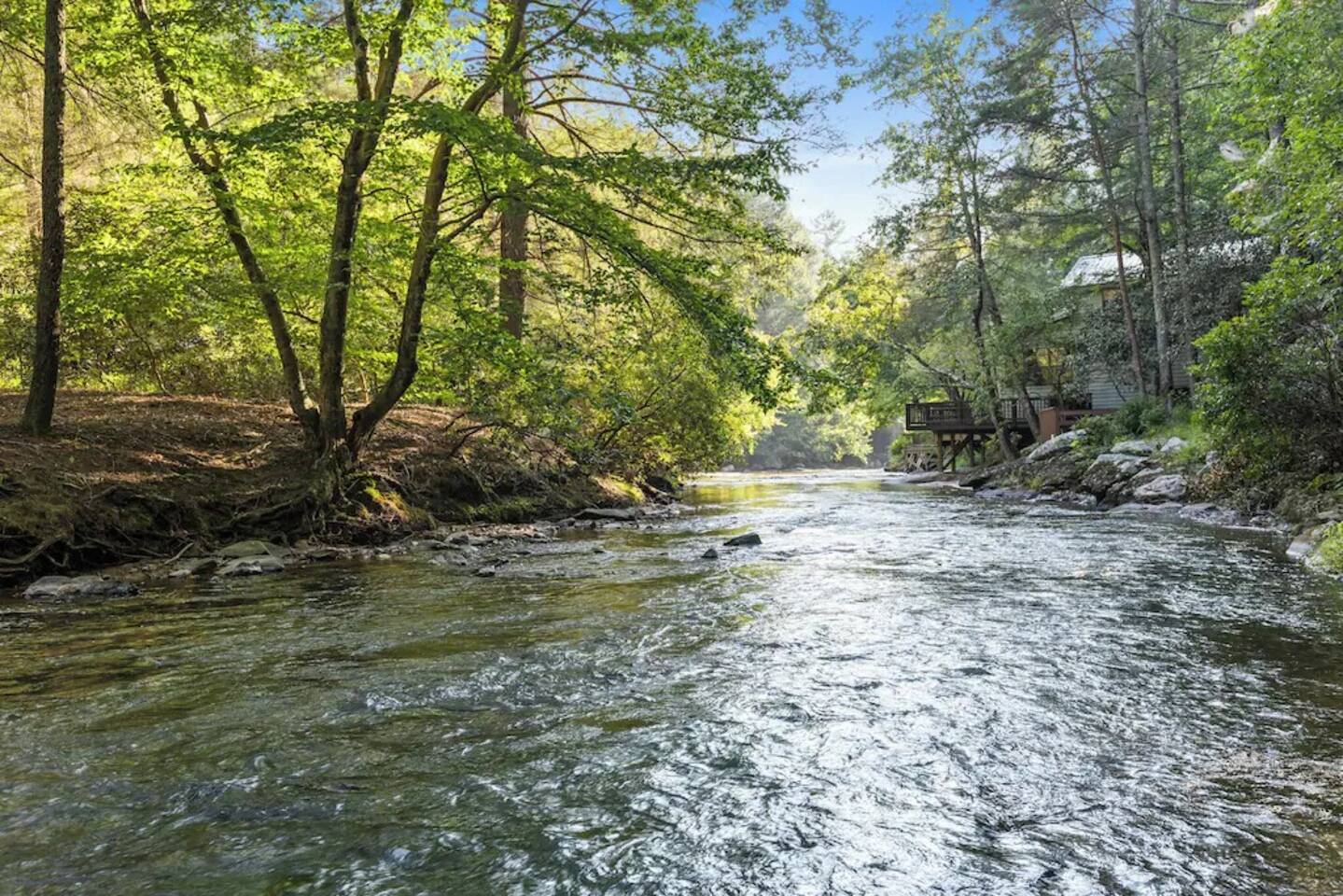 🌟We offer a 5% discount to our primary bookers/ guests who are seniors, military, and first responders!🌟 ✨Key Features: ★ Main level King Master suite with a private bath, walk-in shower, seasonal gas fireplace, and a 42" flat-screen TV. ★ Upper level King bedroom with a private bath, walk-in shower, bunk beds, and a 42" flat-screen TV. ★ Great Room with a 72" flat-screen HDTV, cable, seasonal gas fireplace, and a comfortable sectional sofa. ★ Fully equipped kitchen with an economy-sized oven. ★ Entertainment options including a pool table, foosball table, and arcade games. ★ Private deck with a hot tub, fire pit, and direct access to the riverbank. ★ Fly fishing from the private dock. ★ Dog-friendly (leash required per community rules -- A pet fee of $50/pet/night applies with a $150 per stay minimum, with potential discounts for multiple pets or longer stays). 🏡 Welcome to Whitewater Adventure Lodge - Where Luxury Meets Nature! Imagine waking up to the gentle sound of the Cartecay River flowing right outside your window. As the morning sun dances on the water, you sip your coffee on the deck, surrounded by the serenity of nature. This is not just a getaway; it’s an experience that awaits you at Whitewater Adventure Lodge. ✨The Journey Begins: Your adventure starts the moment you step into the grand great room. The towering ceilings and expansive windows frame the picturesque river views, inviting you to unwind and immerse yourself in the tranquil surroundings. The 72" HDTV with surround sound is perfect for a cozy movie night, while the sectional sofa beckons you to relax by the seasonal gas fireplace. ✨A Culinary Haven: As you explore further, the custom kitchen reveals itself as a chef's paradise. Picture yourself preparing a feast with high-end appliances and ample counter space. The aroma of a delicious meal fills the air as you gather around the dining table, sharing stories and laughter with family and friends. ✨Retreat to Luxury: In the evening, retreat to the King Master Suite on the main level. The luxurious king bed promises a restful night's sleep, while the seasonal gas fireplace adds a touch of warmth and romance. A private bath with a walk-in shower and a 42" flat-screen TV complete this haven of comfort. Upstairs, the second King bedroom offers a cozy retreat with its own private bath, walk-in shower, and additional bunk beds, making it perfect for families. ✨Fun and Games: For those seeking entertainment, the loft is a treasure trove of fun. Imagine challenging your loved ones to a game of pool or foosball, or reliving your childhood with the arcade games. Laughter echoes through the lodge, creating memories that will last a lifetime. ✨Nature’s Embrace: Step outside onto your private deck and let the beauty of the Cartecay River captivate you. The hot tub invites you to soak your cares away as you gaze at the stars. Gather around the fire pit, roasting marshmallows and sharing stories late into the night. And for the adventurous, the private dock offers the perfect spot for fly fishing, where the river whispers its secrets to those who listen. ✨A Home for All: Whitewater Adventure Lodge is not just for you; it’s for your furry friends too. Picture your dog happily exploring the surroundings, making this a true family getaway. ✨Modern Comforts: With WiFi and all the household essentials provided, your stay is effortless and comfortable. From linens and towels to a washer/dryer and initial supplies, every detail is thoughtfully prepared for you. ✨Your Story Awaits: At Whitewater Adventure Lodge, every moment is a story waiting to be told. Whether you seek adventure, relaxation, or a bit of both, this riverside retreat is your perfect sanctuary. Book now and let the magic of Whitewater Adventure Lodge become part of your story. Your unforgettable riverside adventure starts here! Escape to Whitewater Adventure Lodge for a luxurious and memorable retreat. 🔑 Book now and experience the perfect blend of nature, comfort, and entertainment. Your riverside adventure awaits! Please check out all our properties in our profile as we have homes of all different sizes and amenities and locations to suit your needs!